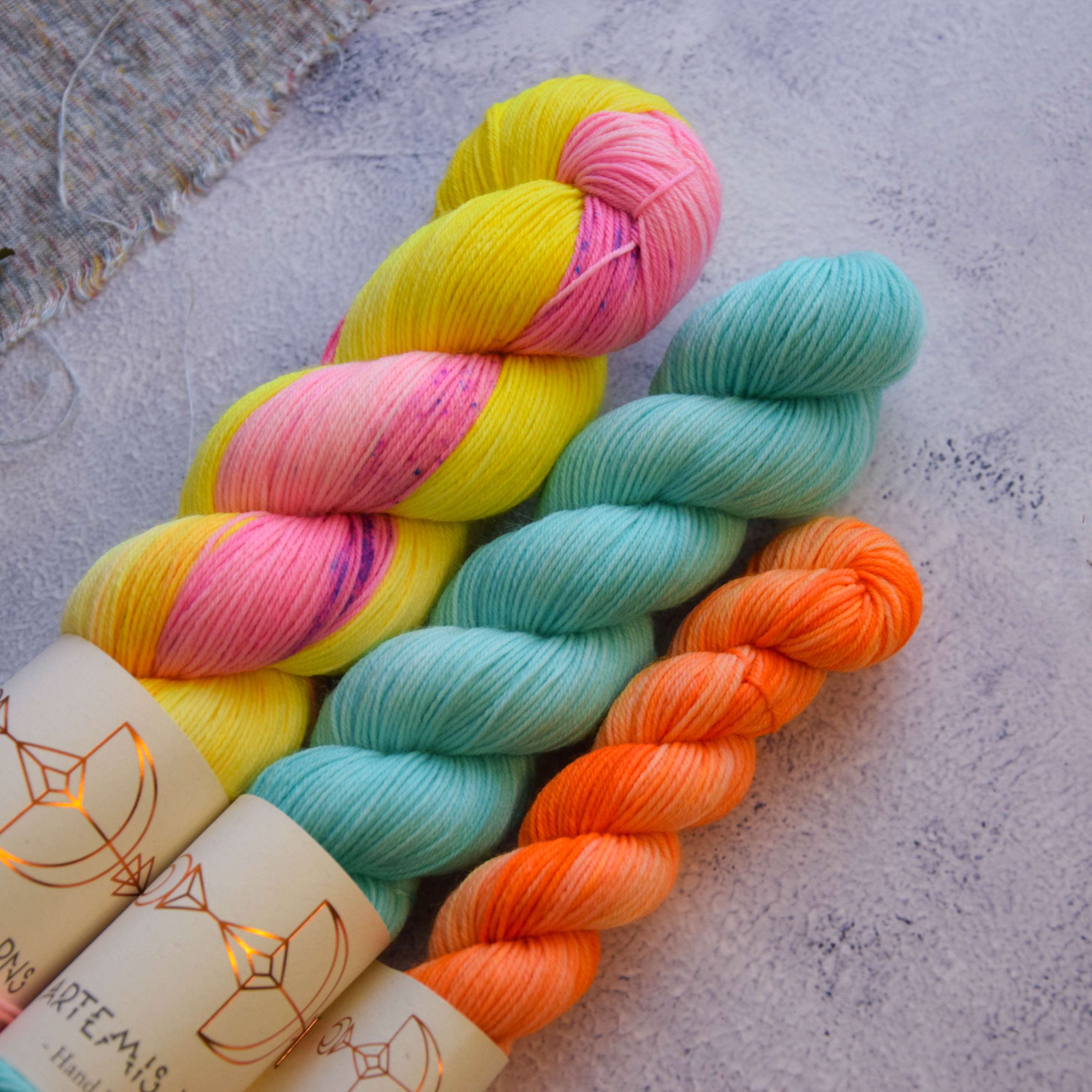 This Artemis Sock set is composed of one 100g skein colorway Aurora, a 50g skein colorway Snake eye and one 20g mini skein colorway Topaze