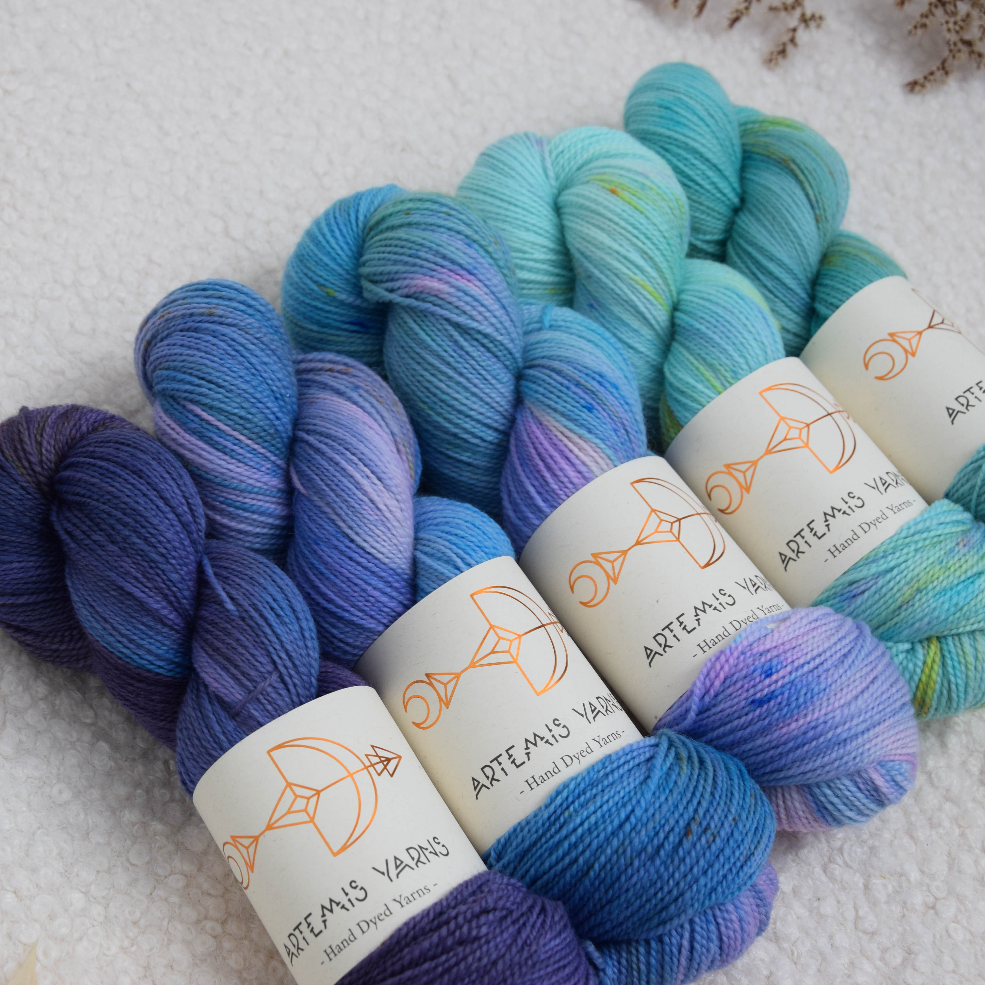 You will receive 5 Arcadia sport skeins, in the following colorways: Eurydice, Amphitrite, Underwater, Sea Nymph and Nereids.