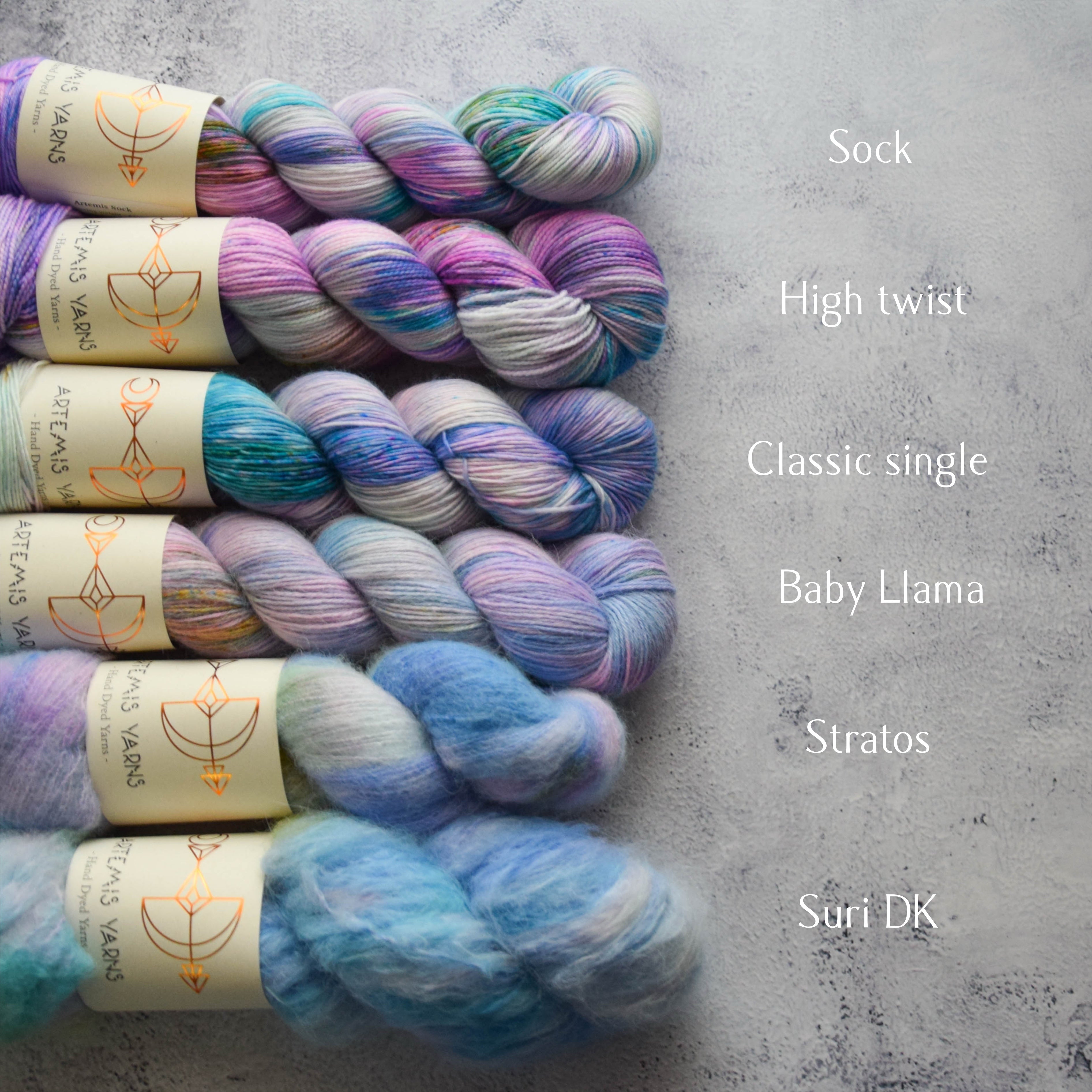 Fingering : Artemis Sock (100g, 50g, 20g), Artemis Soft Sock (100g, 50g), Artemis Classic single (100g, 20g), Artemis Squishy Single, Artemis High Twist (100g, 50g, 20g), Artemis Meadow fingering, Artemis Yak sock, Artemis Mohair Merino, Artemis Sprinkles Fluff, Artemis Sprinkles fingering, Artemis Stellina fingering.