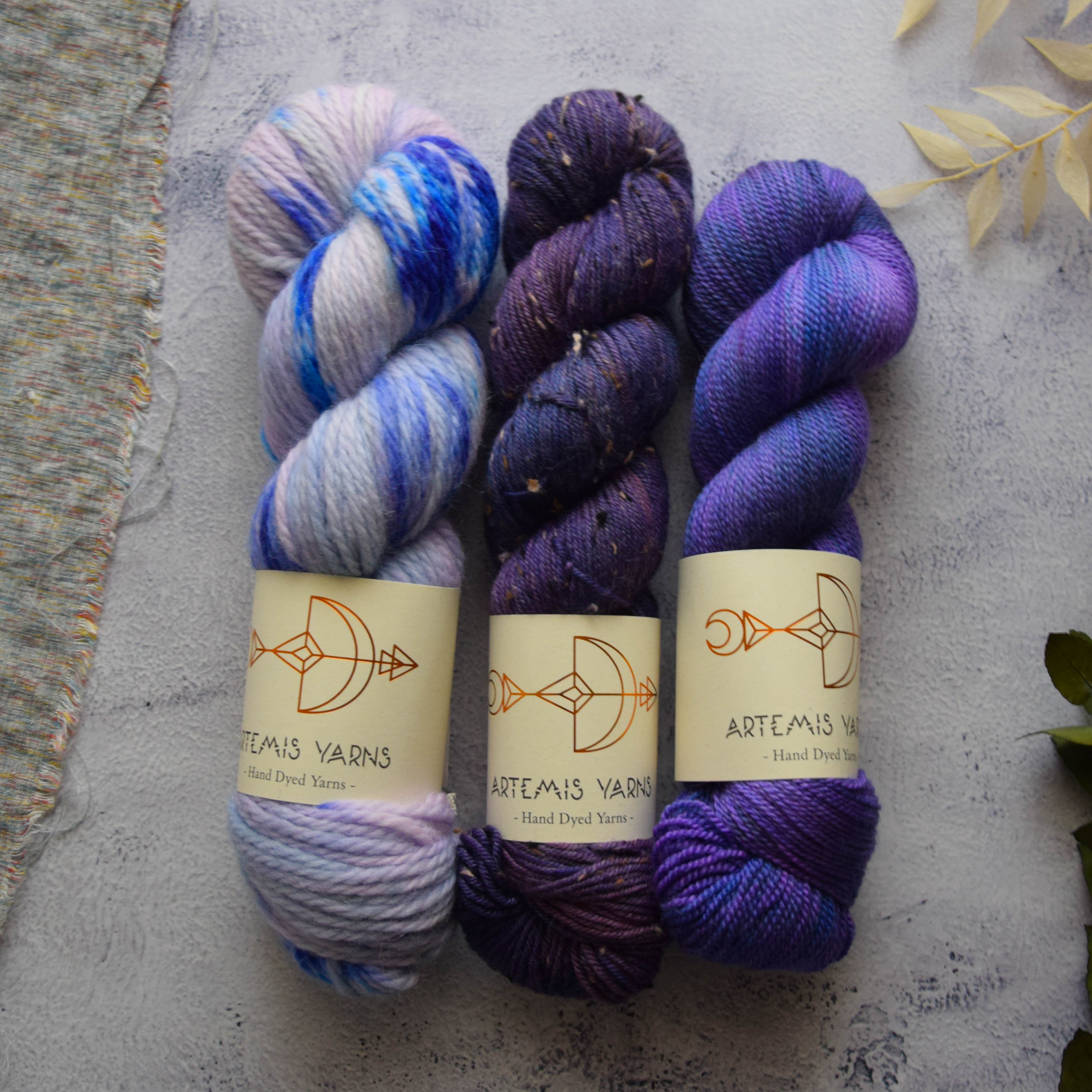 Set of 3 skeins : 1 skein of Artemis Chunky colorway Wisteria, 1 skein of Artemis Tweed DK colorway Happy dye, 1 skein of Artemis Merino silk DK colorway Happy dye.