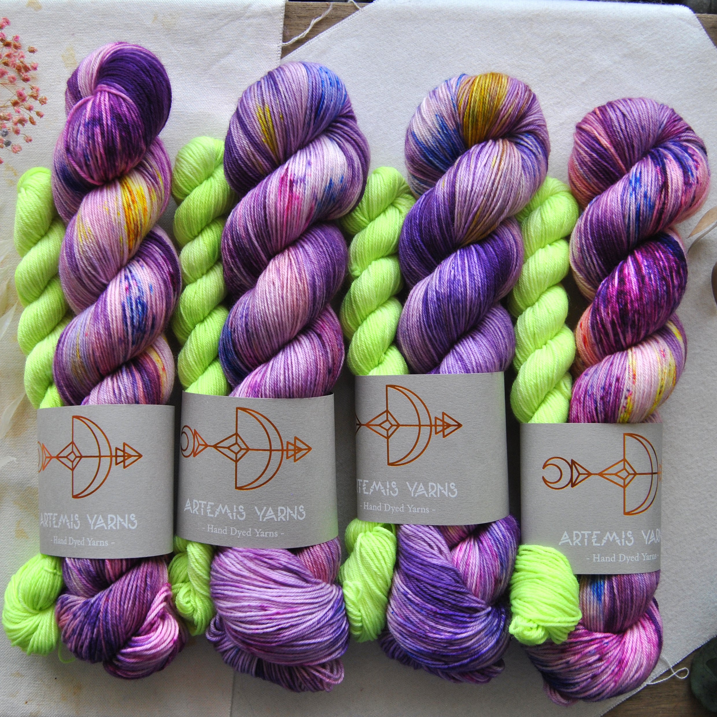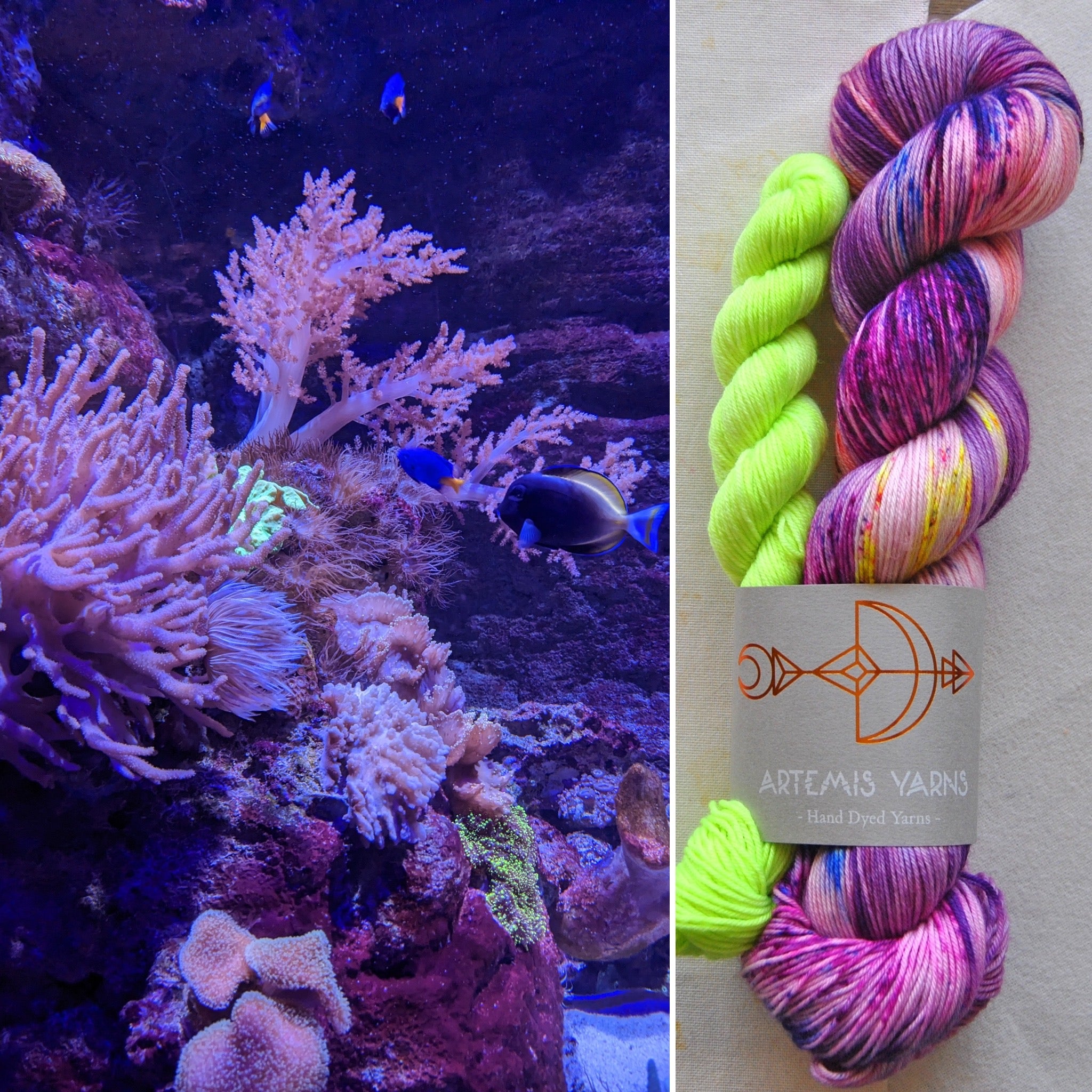 You will get one 100g skein of colorway Coral reef and one 20g mini skein of colorway Bioluminescent, in my Artemis sock base.