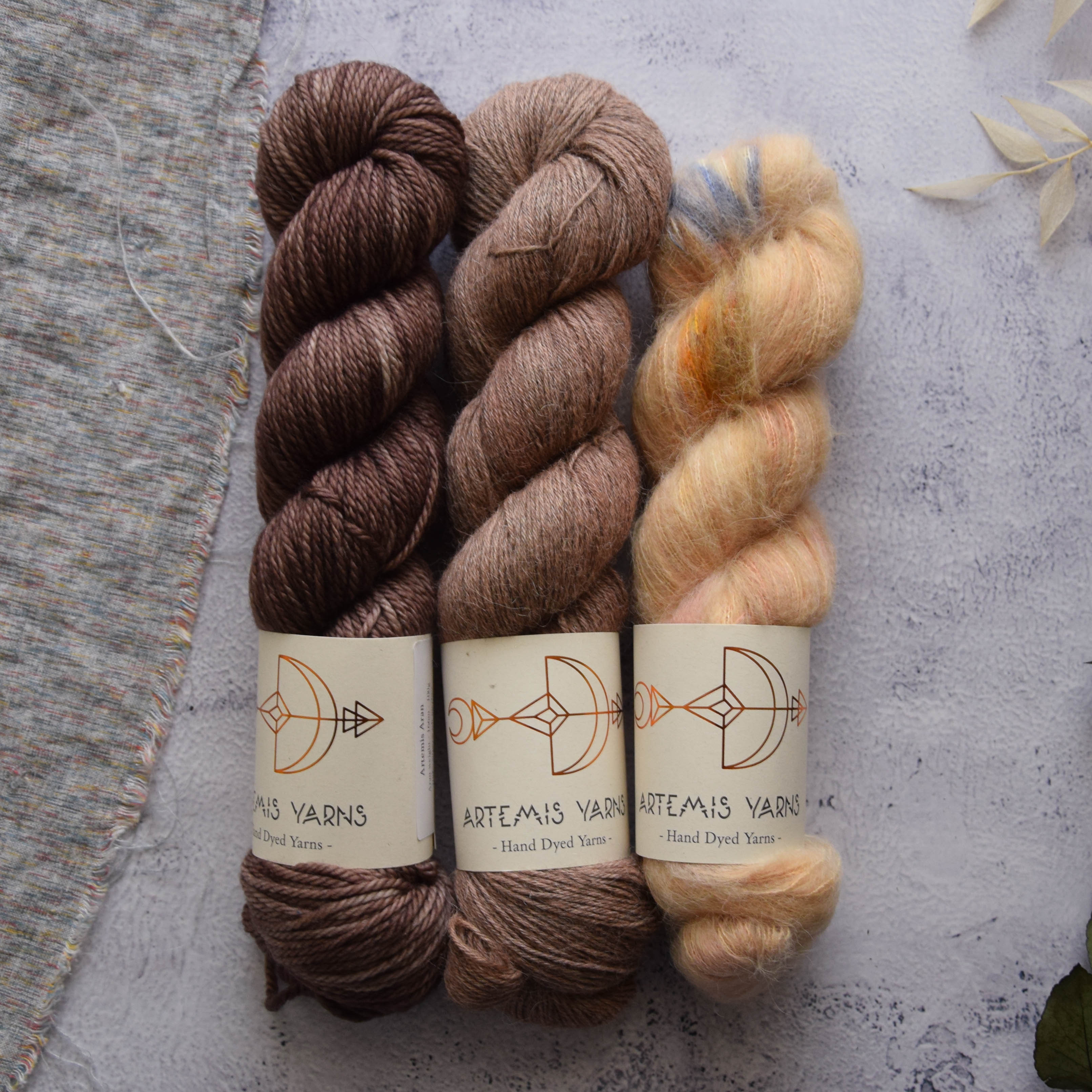 Set de 3 écheveaux : 1 écheveau de Artemis Aran coloris Happy dye 22, 1 écheveau de Artemis Baby llama Happy dye, 1 écheveau de Artemis Baby suri lace coloris Pathways.