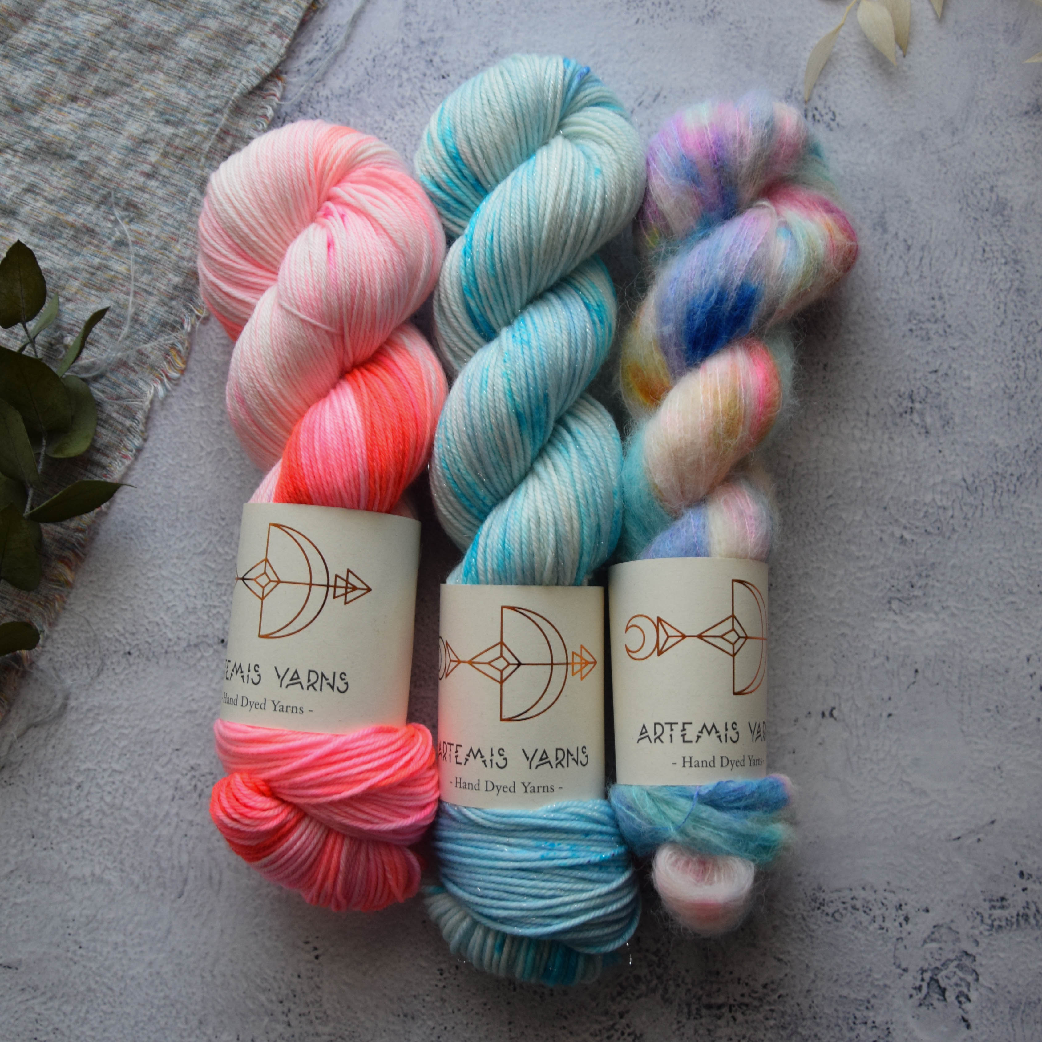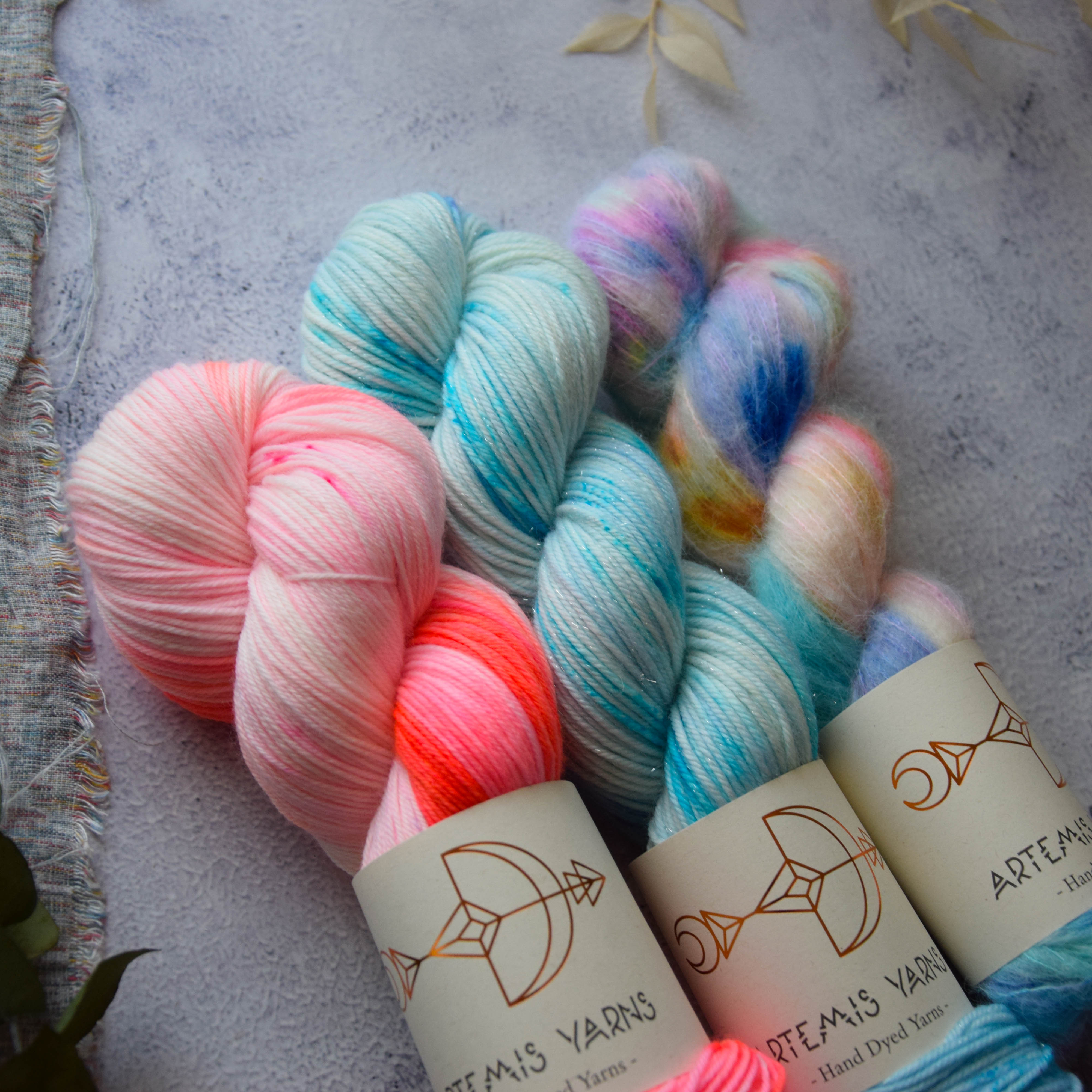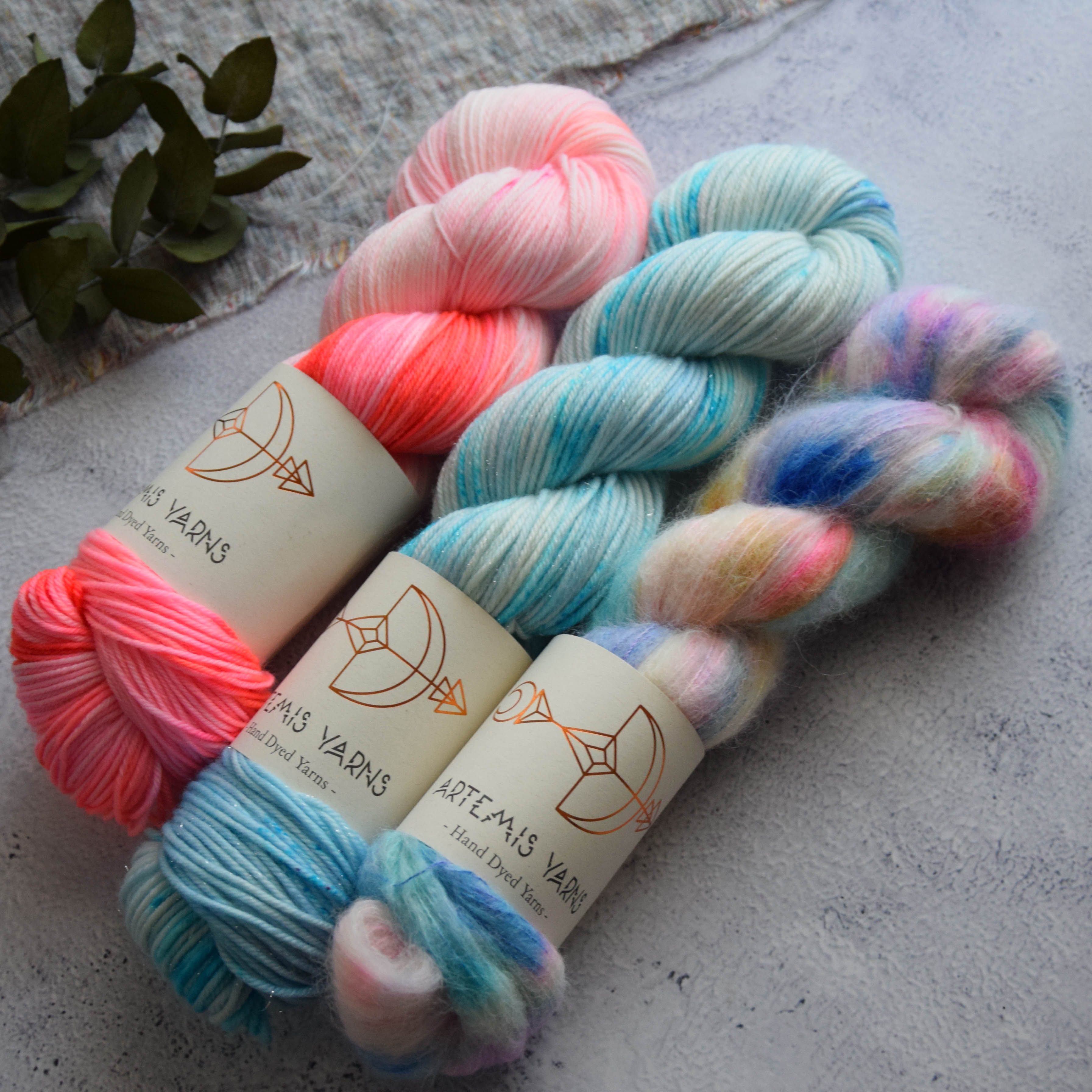Set de 3 écheveaux : 1 écheveau de Artemis Soft Sock coloris Strawberries and cream, 1 écheveau de Artemis Stellina DK coloris Snowflake, 1 écheveau de Artemis Baby suri lace coloris Dream.