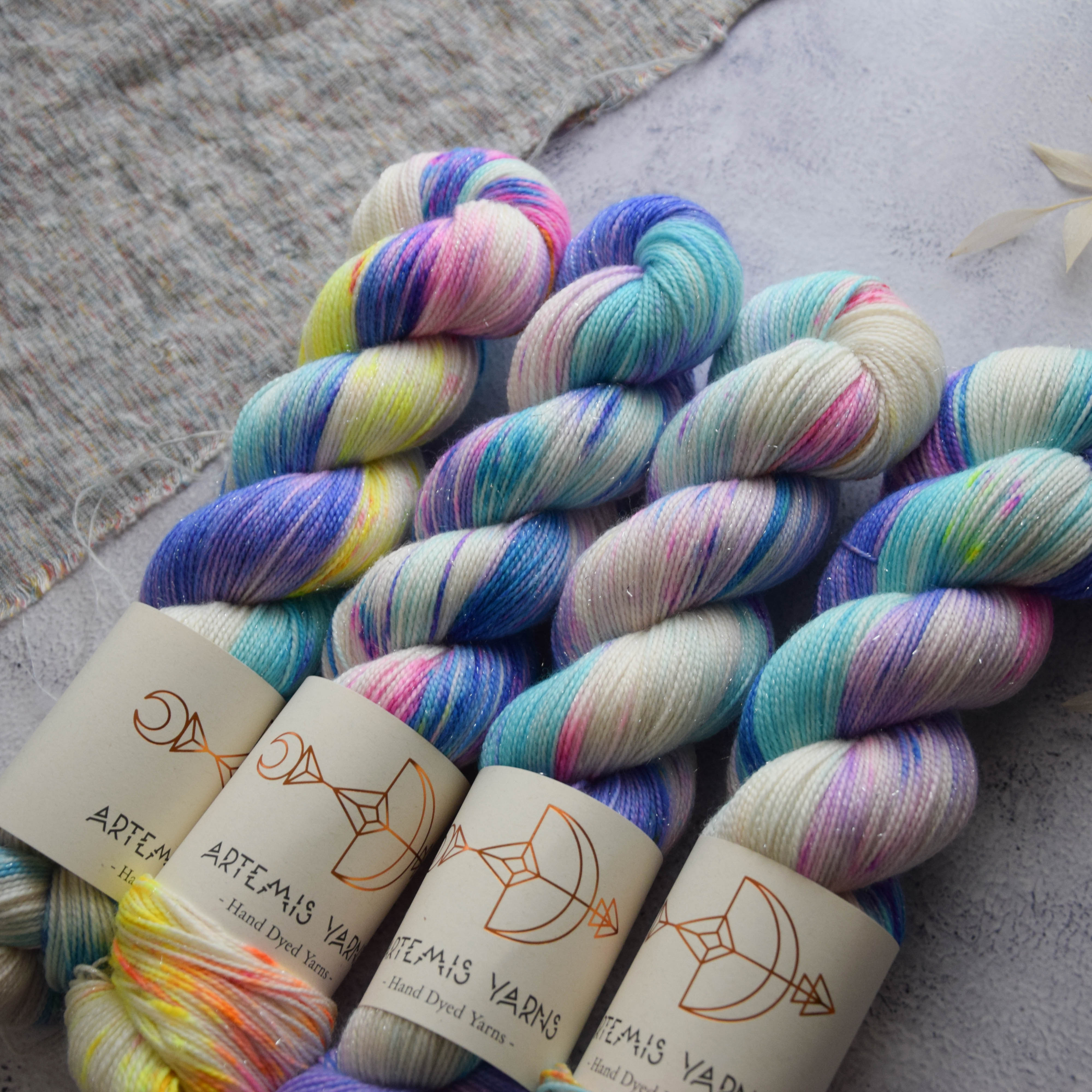 Une base chaussettes robuste, mérinos superwash mélangé avec une touche de fil stellina brillant argenté et du nylon pour plus de durabilité, parfait pour les chaussettes, les vêtements et les châles.