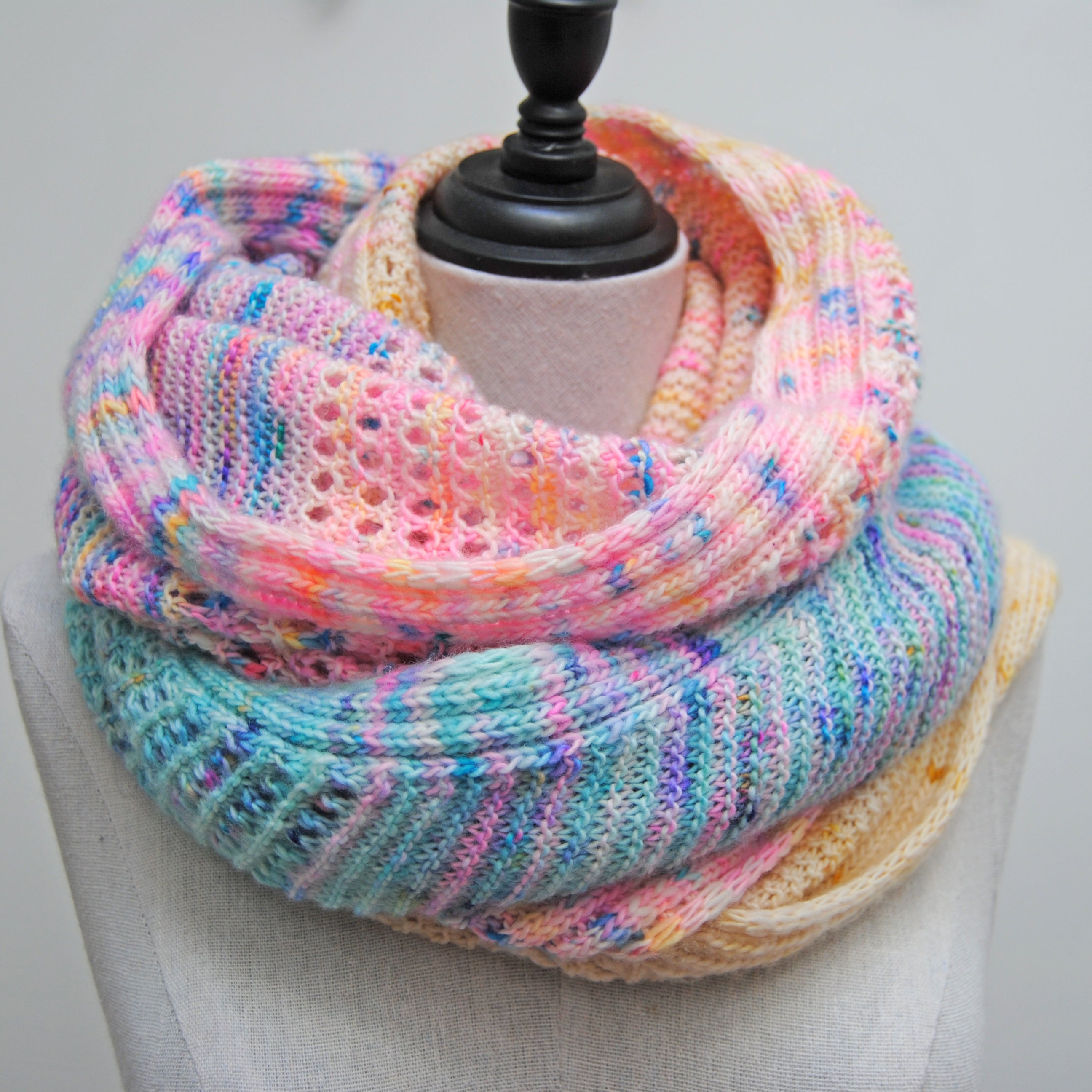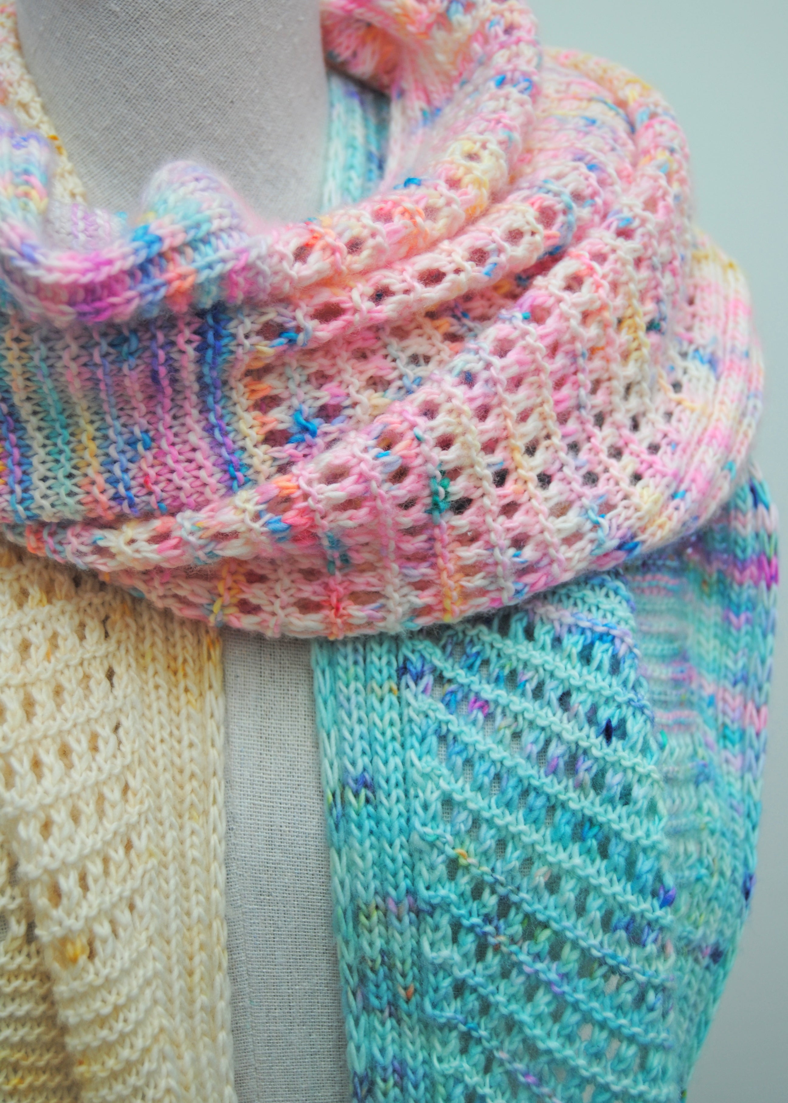Dreamer version (Ivory to Turquoise fade) knit in size small, in Artemis single, colorways Vestal, Unicorn poop, Pandora’s box and Icarus, one skein of each, see pattern for exact yardage used.