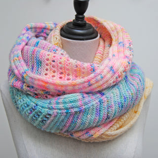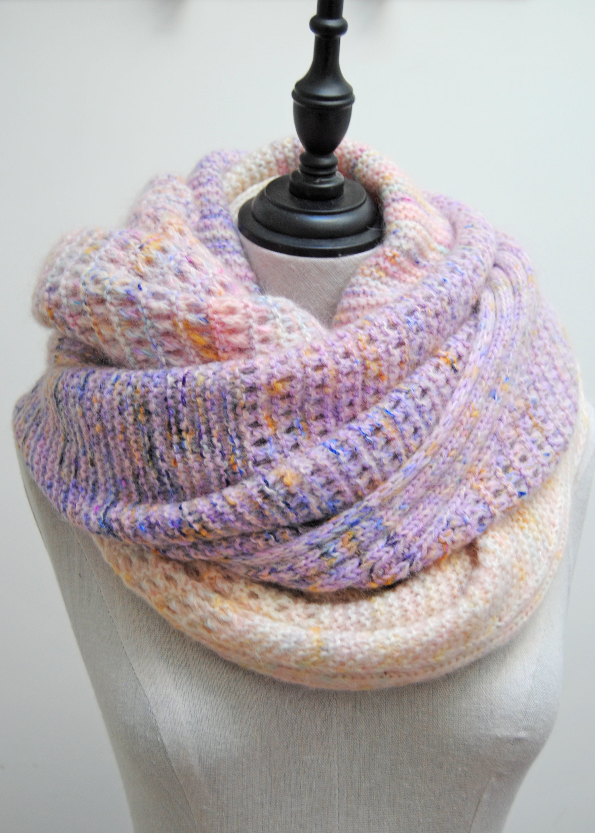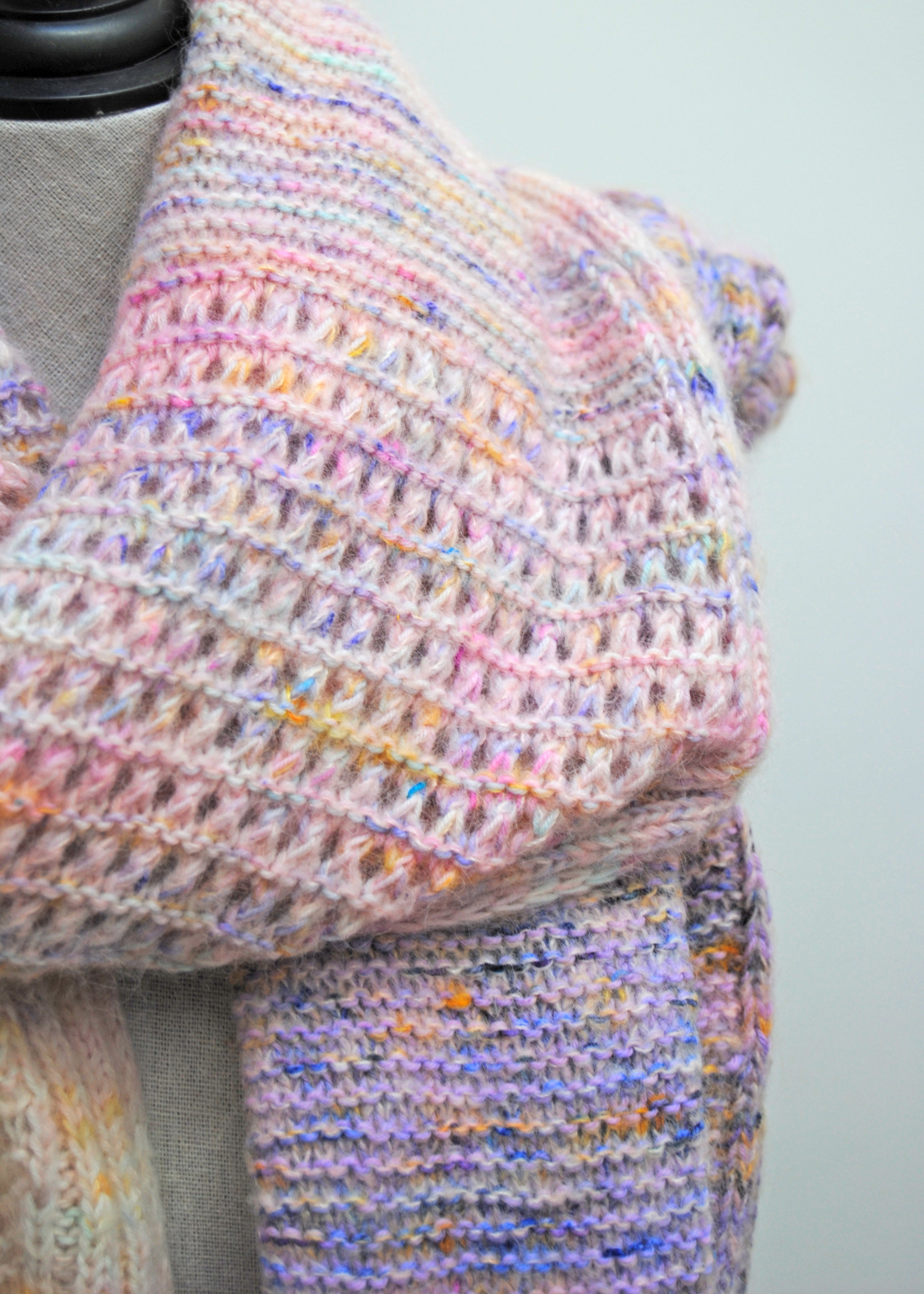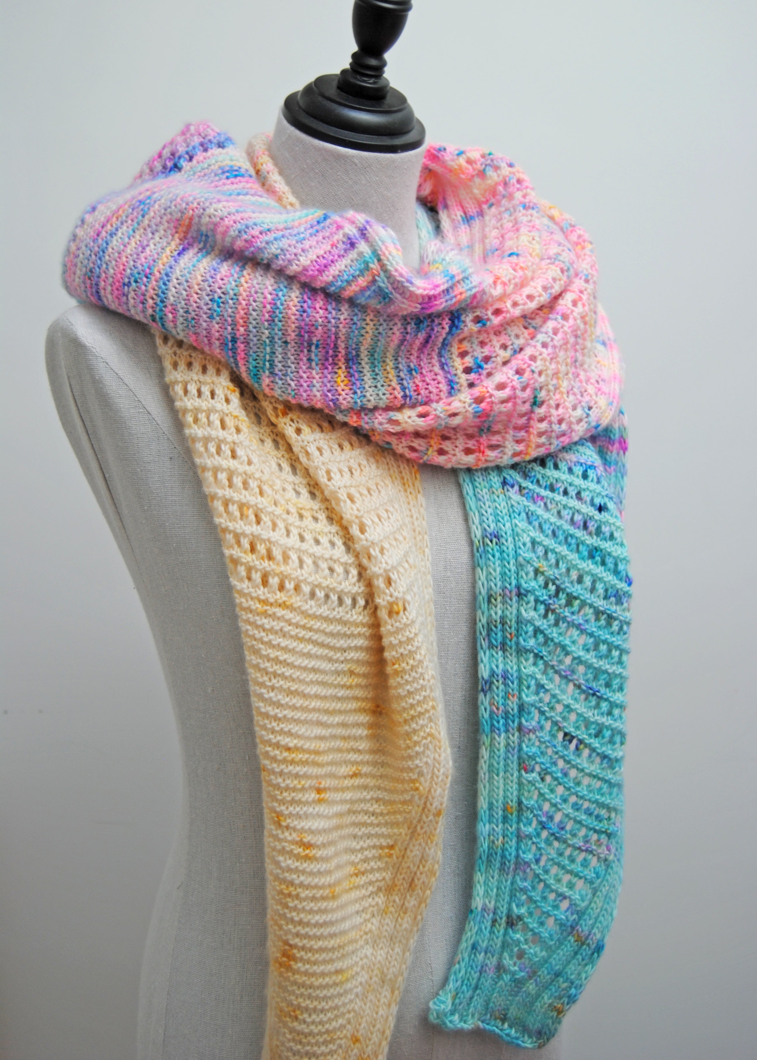 Sweet lullaby version (Light pink to purple) knit in size small, in Artemis sock held together with Artemis Stratos lace, colorways Cutie, Kore, Musa and Mystical for the fingering weight, one skein of each, and Lullaby for the lace, see pattern for exact yardage used.