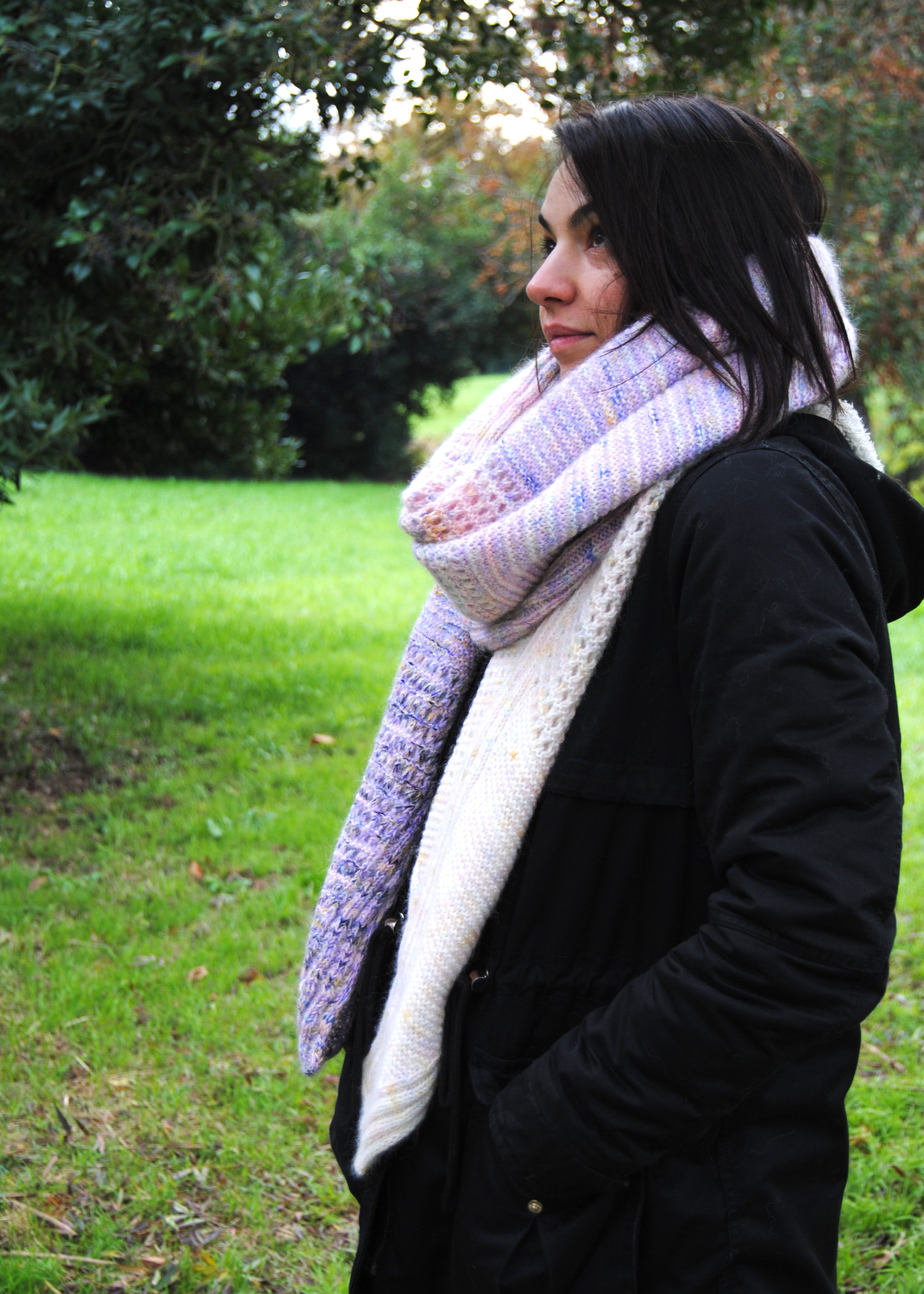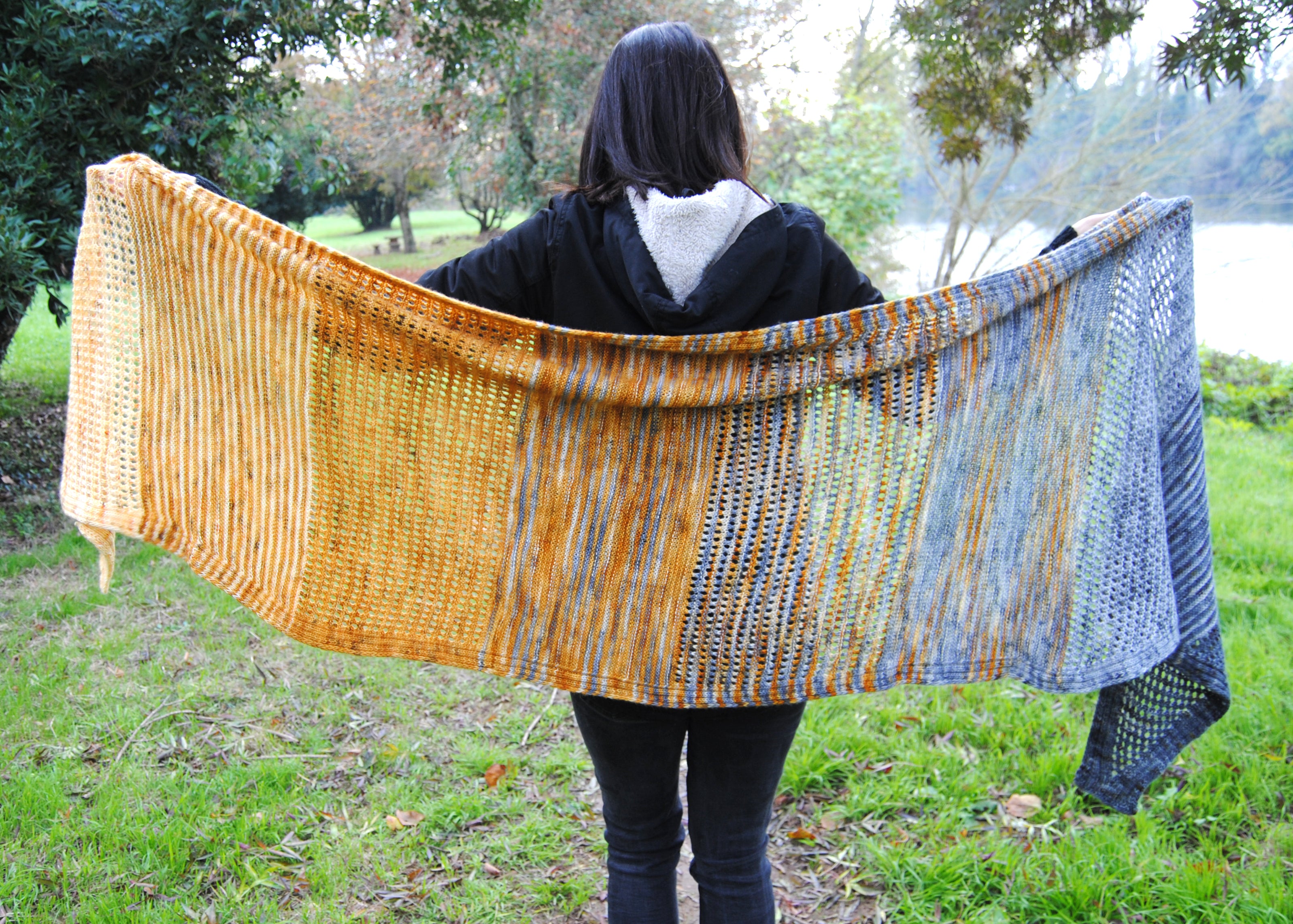 The Moon Cloud shawl has been designed with my signature mini skeins fading advent, but I loved the pattern so much I really wanted to decline it in other variations. A 4- or 5-color fade, to use those pretty 4 or 5 skeins fades sleeping in your stash, or the simple yet stunning one color version, to let the simplicity of the pattern shine. The 24 mini skeins fade is only written for the Large size, since you will need room to slowly fade all your 24 colors. But the 4- or 5-color fade version and the one color version are both written for 2 sizes.