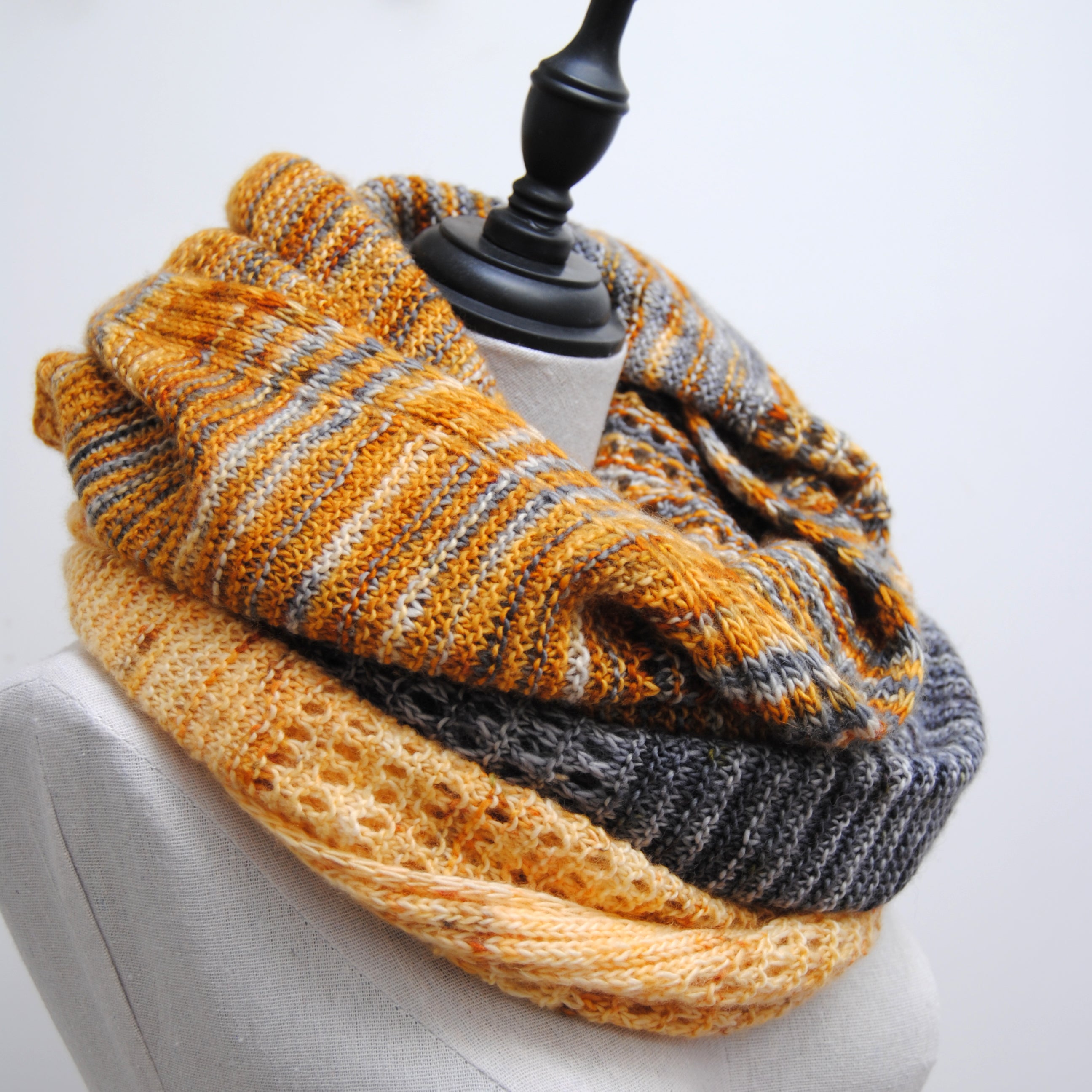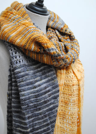 Lallybroch version (Gold to Dark grey fade) knit in size large, in Artemis single, colorways Dragonfly in amber, Amber, Lallybroch, Minotaur and Doomed, one skein of each, see pattern for exact yardage used.